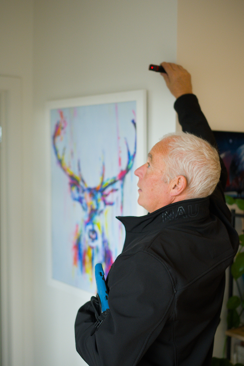 The first step of the energy assessment is measuring, and lots of it. Johnson uses a laser measure to take detailed measurements of floor area, ceiling heights and windows in the apartment.